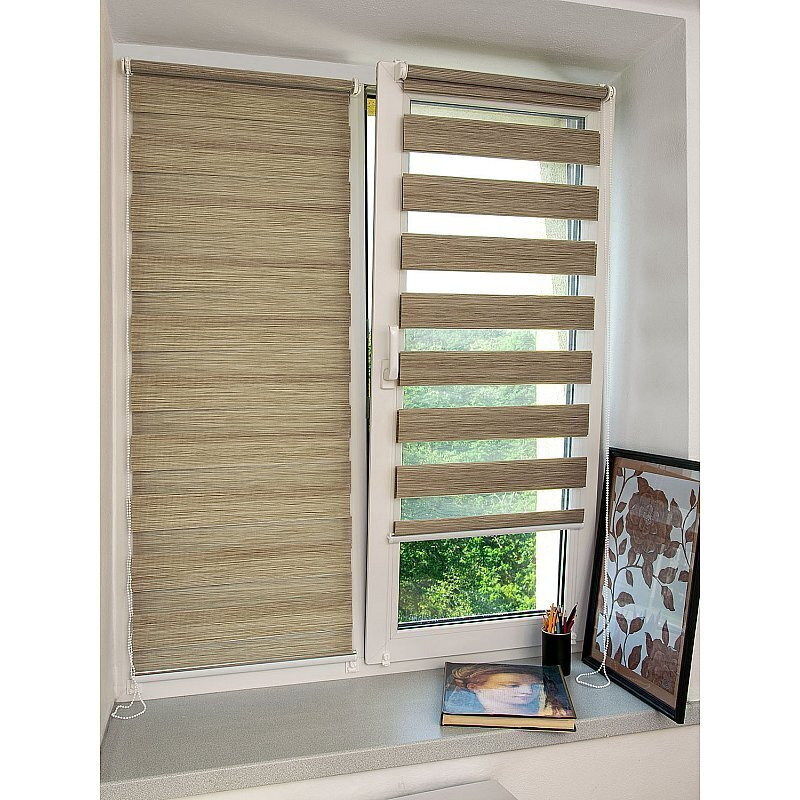 Рулонные шторы «День-Ночь» состоят из полотна, в котором чередуются параллельные полосы плотной и прозрачной ткани. Когда полосы совмещены так, что плотные закрывают прозрачные, свет почти не проходит. Когда прозрачные полосы выстраиваются напротив прозрачных, в комнату проникает дневной свет. По внешнему виду чередование полос действительно напоминает зебру, отсюда второе название.
